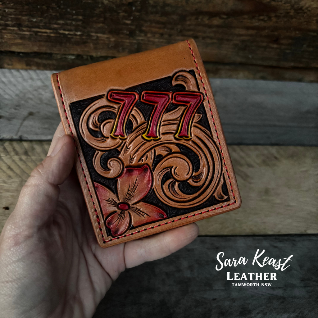 Features a hand drawn and tooled floral design with rolling 7’s and ace cards, and well as a red interior.